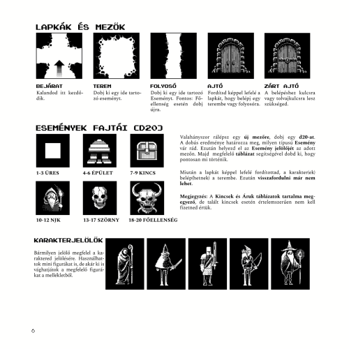 A kazamata-lapkák pedig külön íveken, 350g-os papíron, kivágásra készen várják a bevetést. (Társasjáték minőség!) Egyoldalas szabálymagyarázat, karakteralkotás és megannyi random táblázat bújik meg ebben a kiadványban!